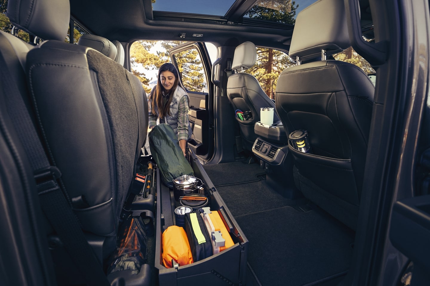Step inside the F-150 Lightning's cabin and find a familiar yet refined space. The extra-large infotainment display takes center stage, providing easy access to all your entertainment and vehicle information needs. Additionally, the front-trunk cargo bay offers ample storage space for all your gear, making the F-150 Lightning a versatile companion for any adventure.