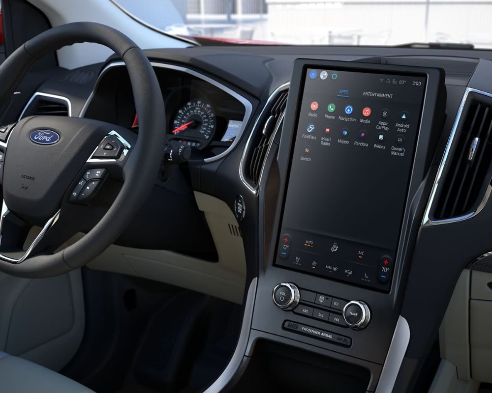 Inside, the Edge is nothing short of luxurious. The latest infotainment system features a large vertical touchscreen central to the dashboard. Comfort meets style with upscale upholstery options, and practicality is not overlooked with 39.2 cubic feet of cargo space behind the second row.